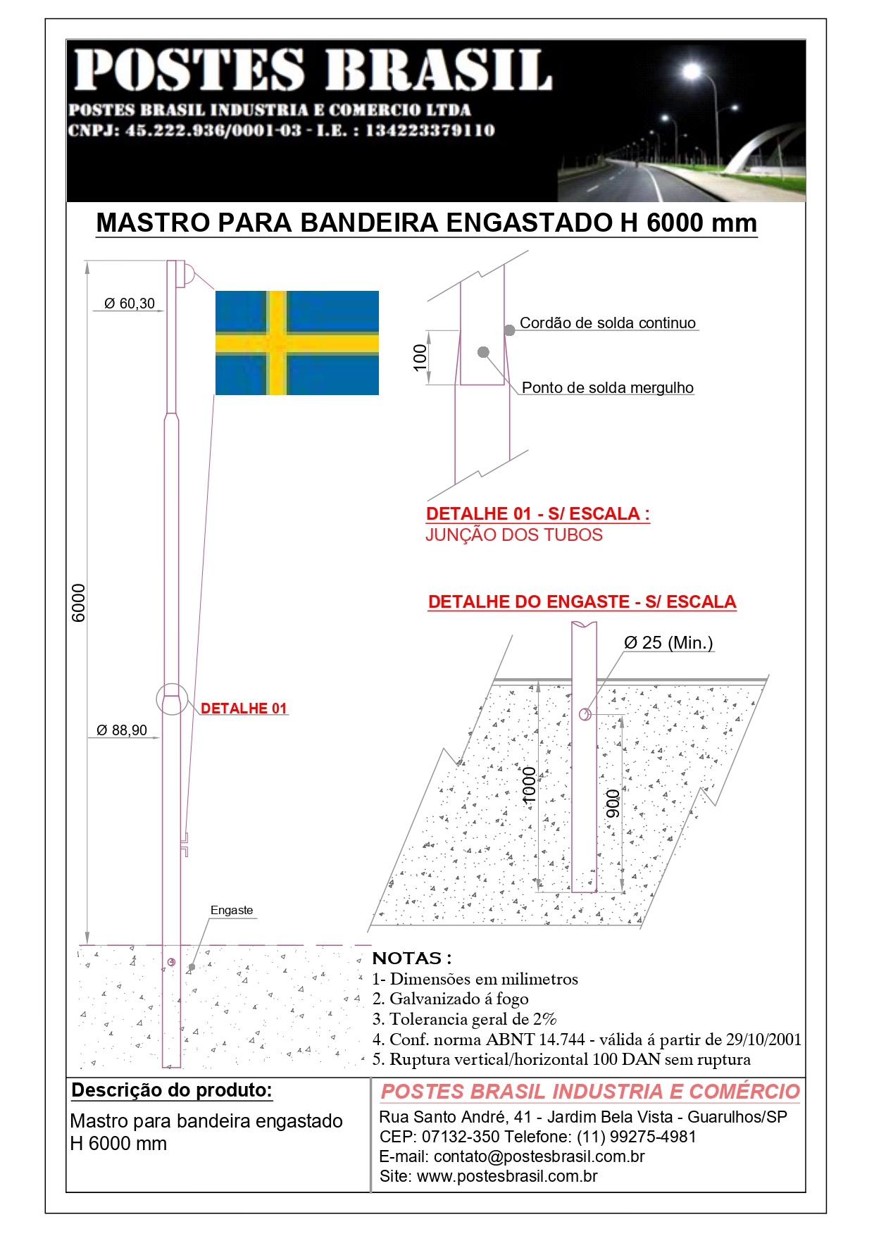 - Mastro Para Bandeira Engastado H 6000 mm