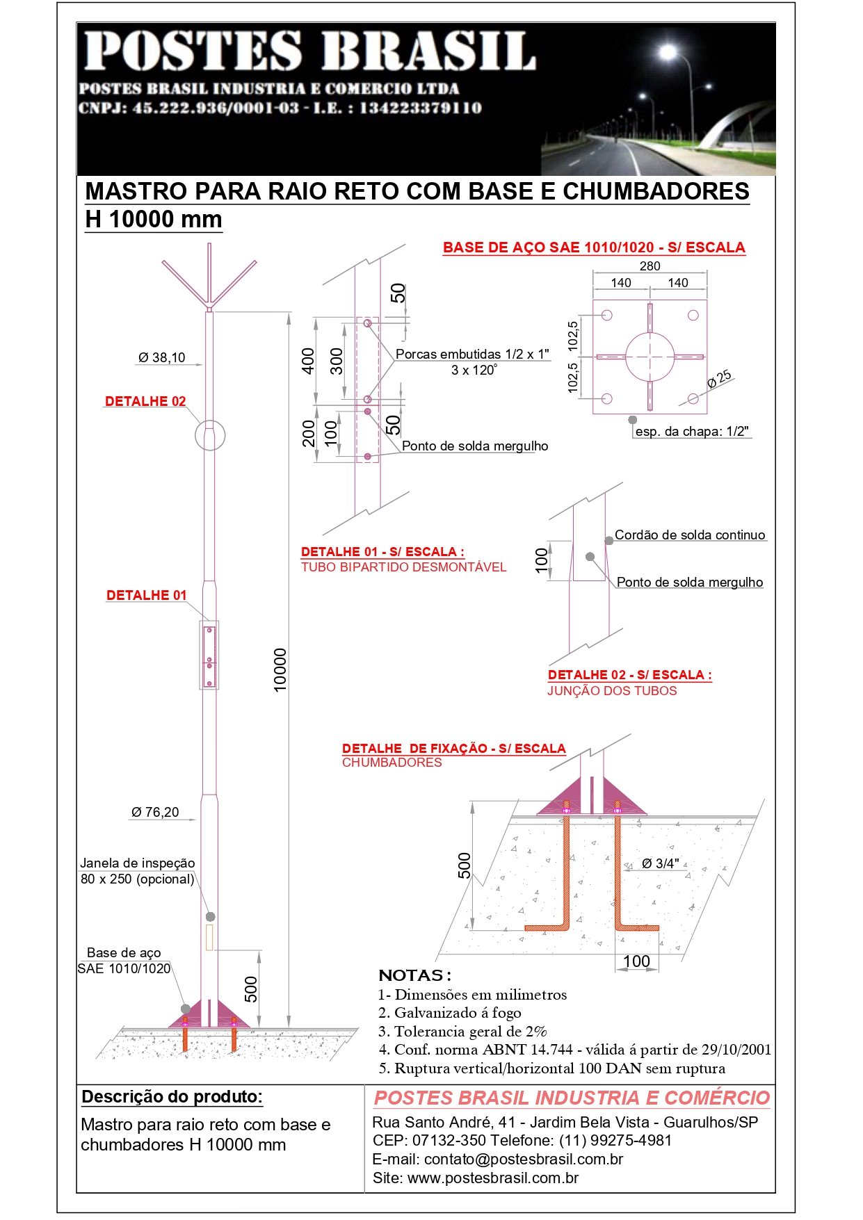 - Mastro Para Raio com Base H 10000 mm