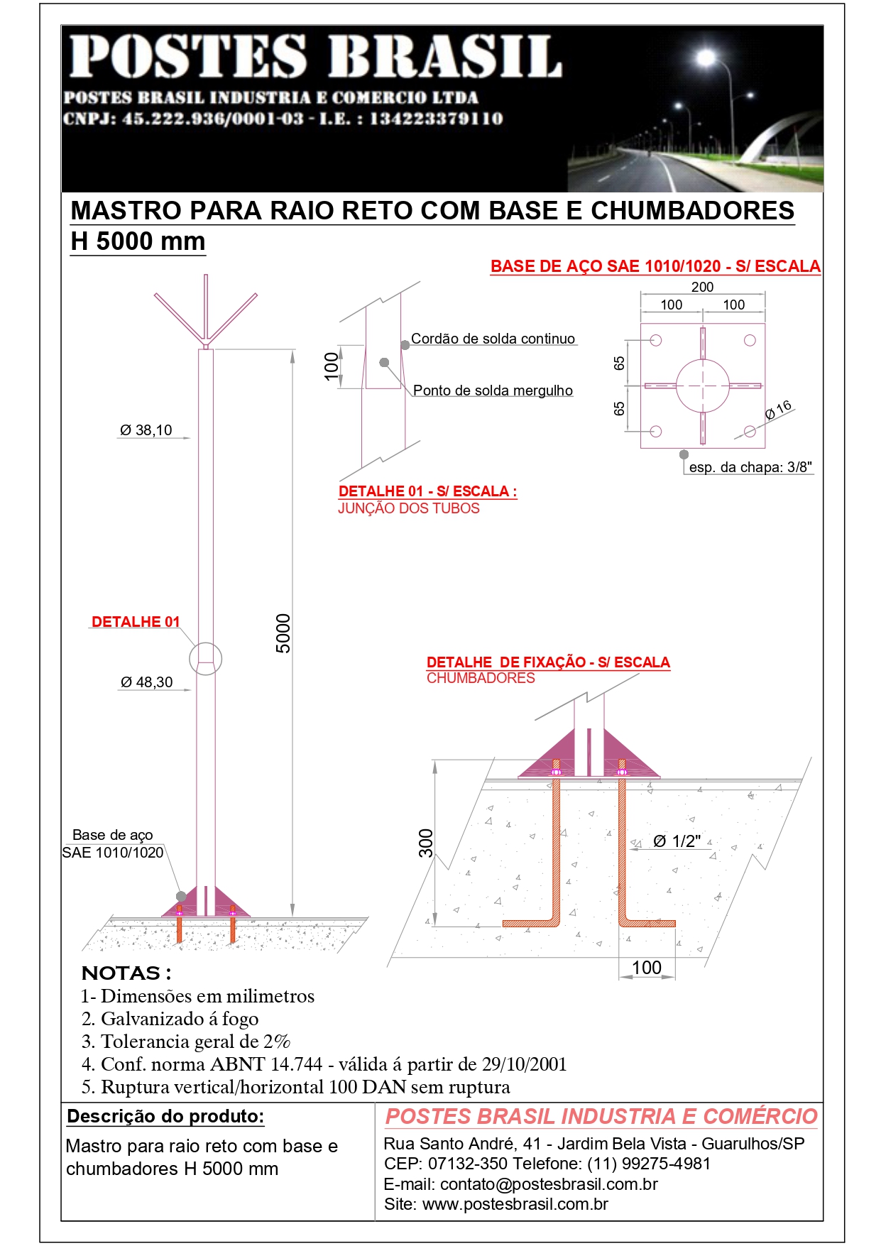 - Mastro Para Raio com Base H 5000 mm