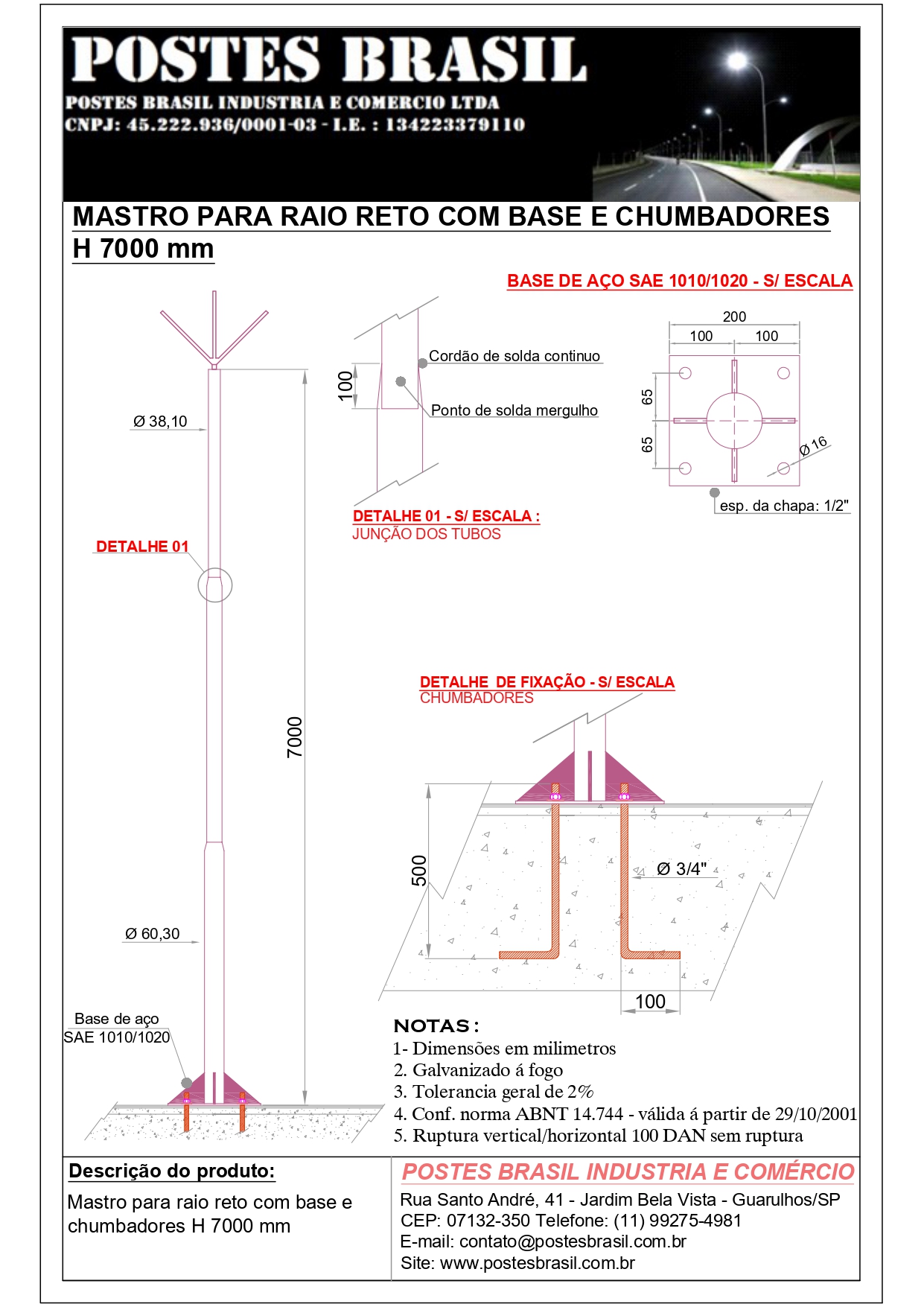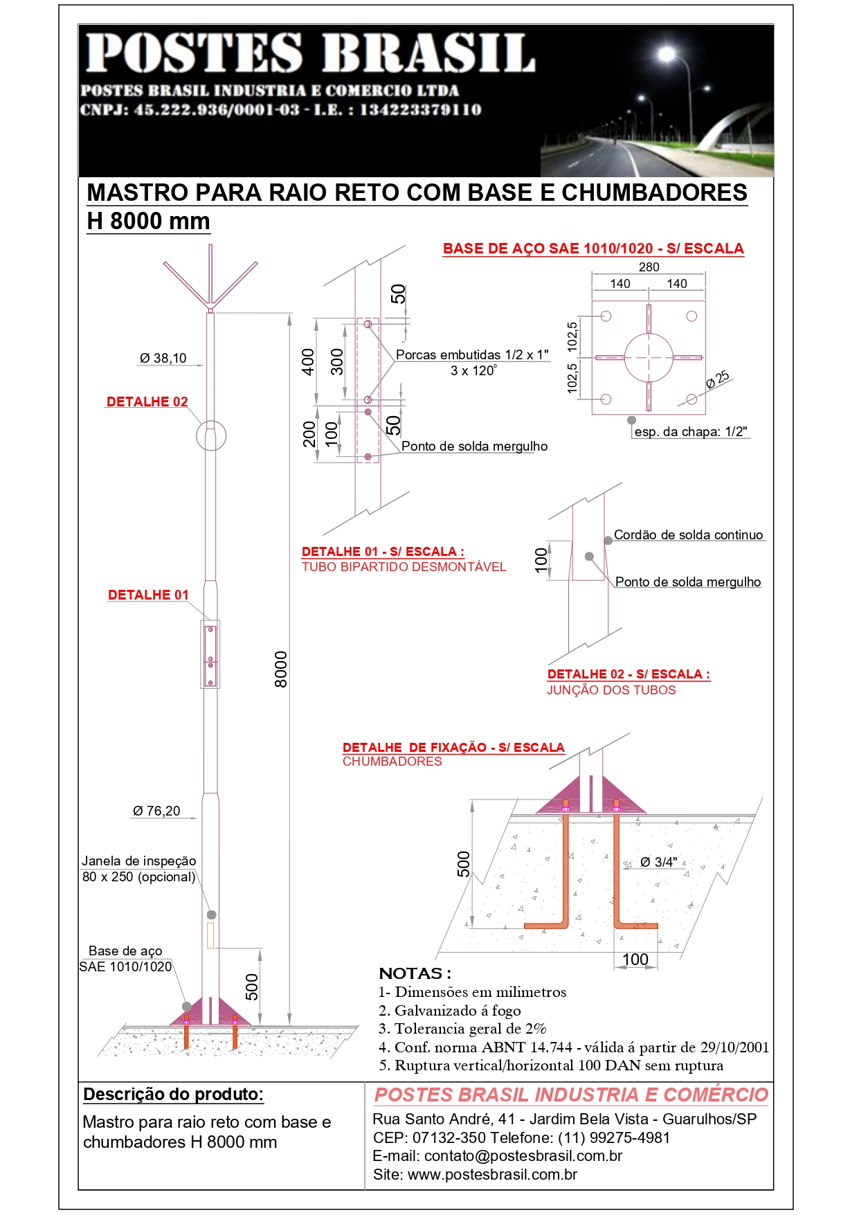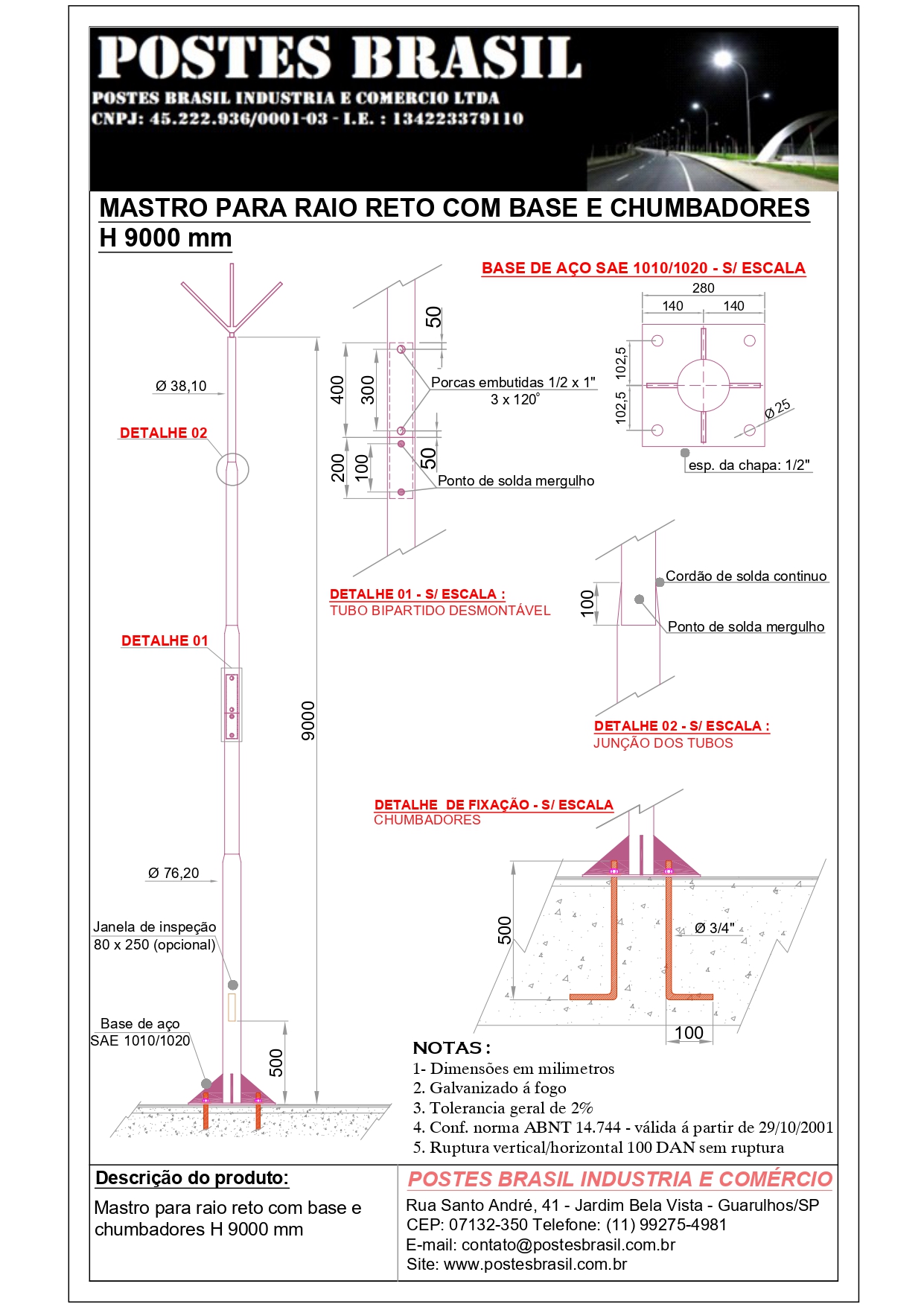 - Mastro Para Raio com Base H 12000 mm