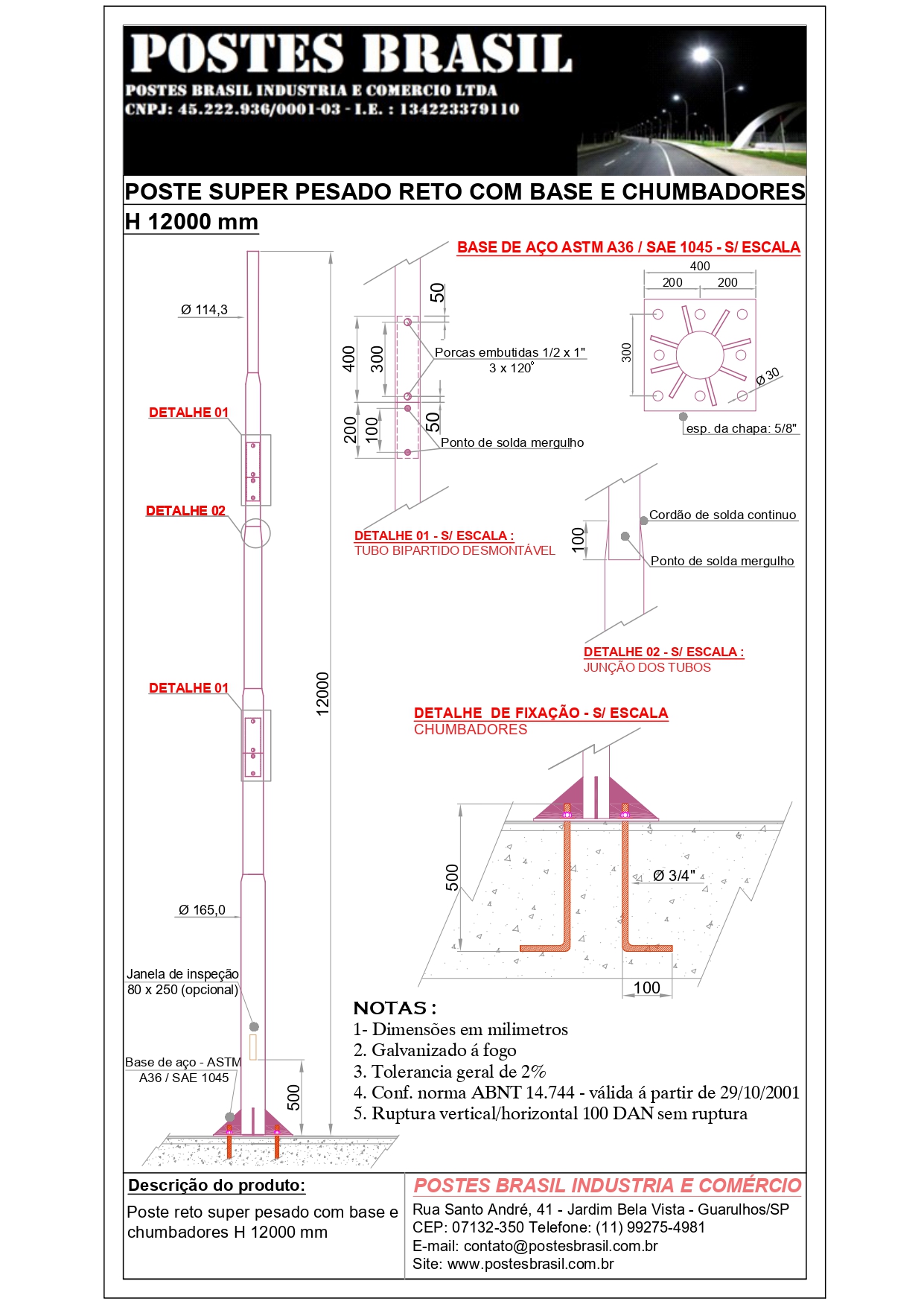 Poste Super Pesado Reto com Base H 12000 mm