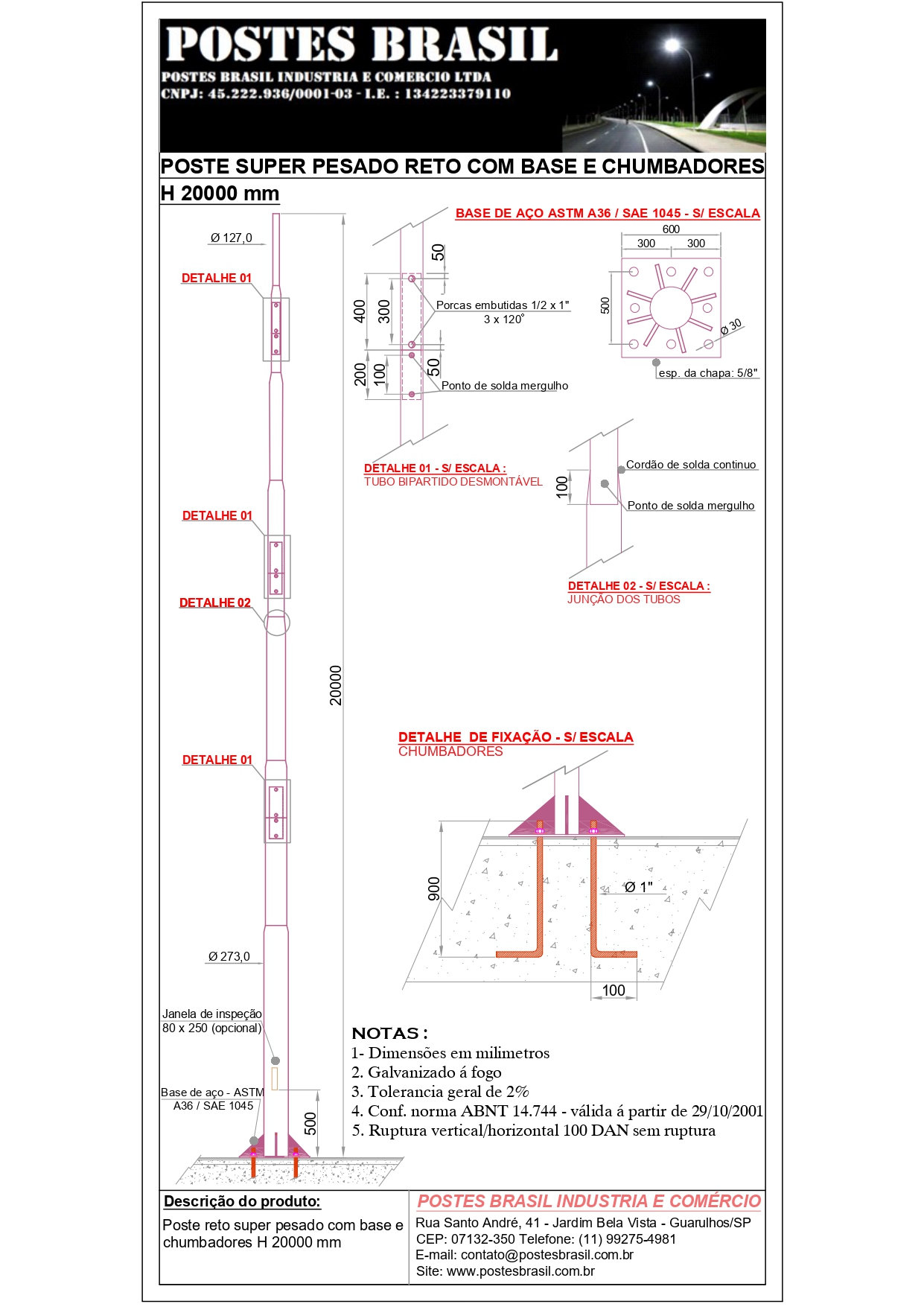 Poste Super Pesado Reto com Base H 20000 mm